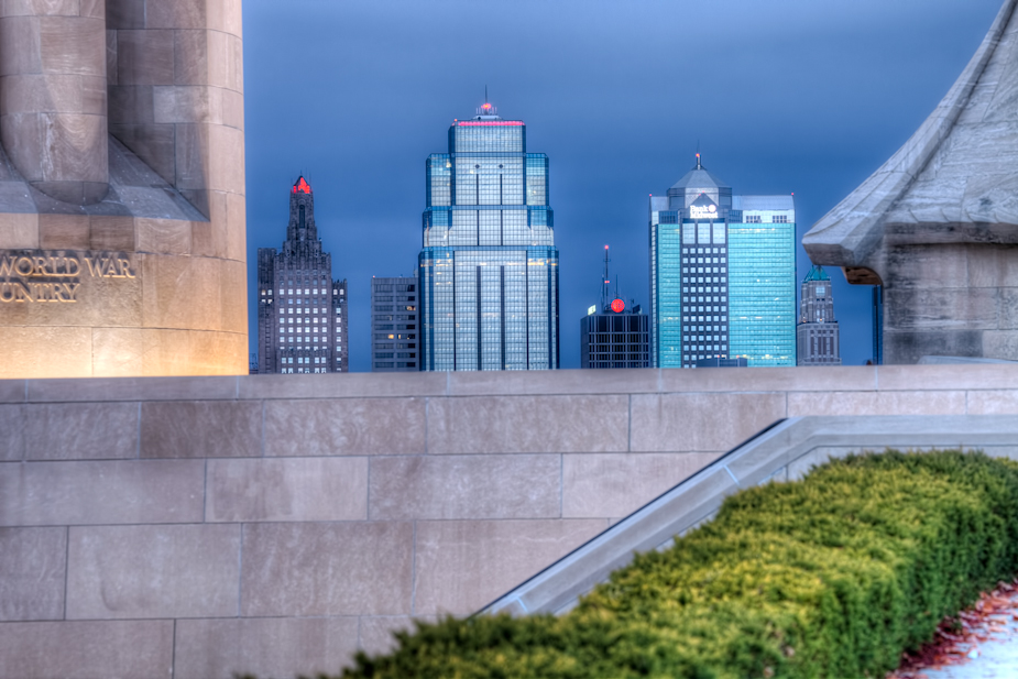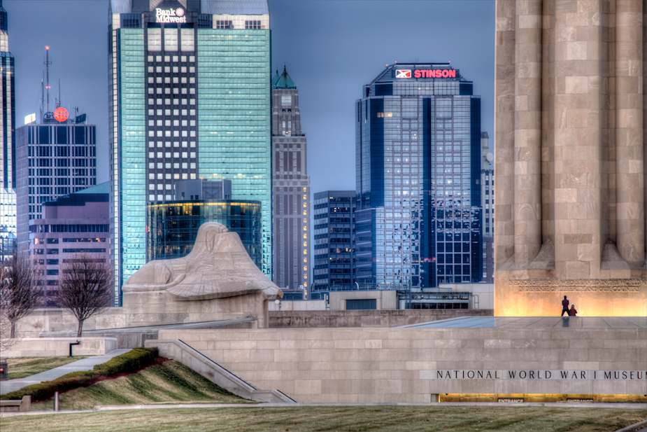 Here we have a couple shots from near the gates to the driveway at Liberty Memorial, a couple closer up from along the sidewalk looking toward the skyline and past the Memorial with my long telephoto lens, then off to the side where I climbed up to a spot I’ve gone to three or four times now without being told by any security staff to get down. This spot allows for a slightly atypical view than the usual scene from directly north of the Memorial base – and from here you can practically make the Kauffman Center sit right behind Union Station in the photo.
