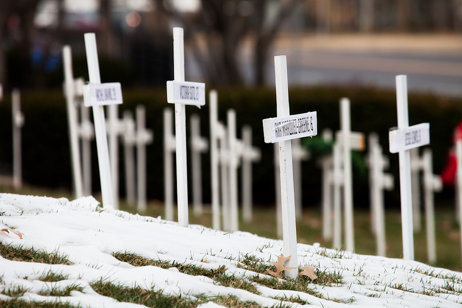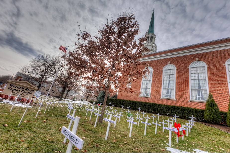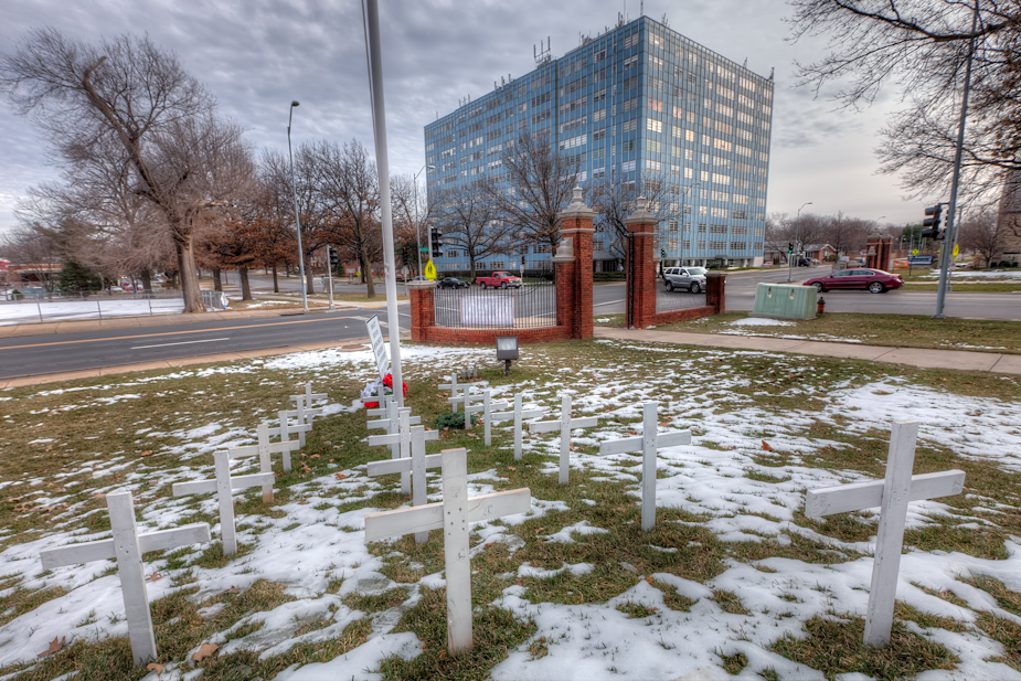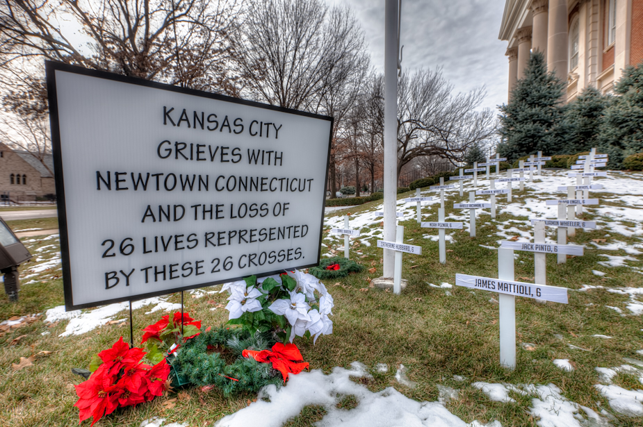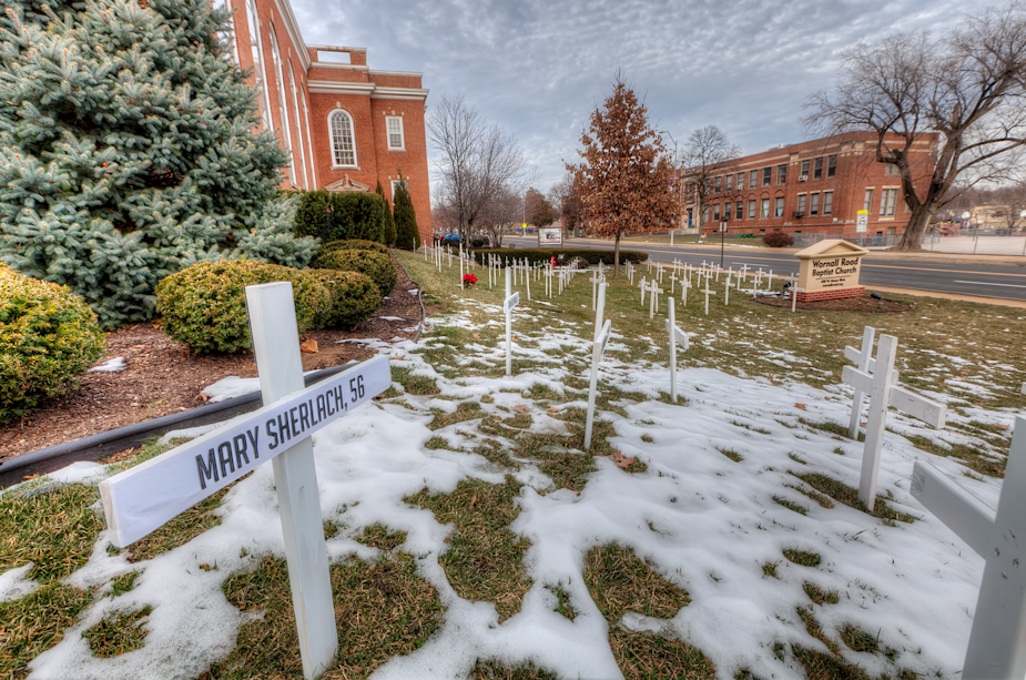 All shots from Sunday Dec 30 in the afternoon – stopping at Wornall Baptist Church Brookside for shots of the crosses for the KCMO homicide victims this year – triple digits for 2012. There were additional crosses in memorial for the Newtown, Connecticut massacre as well.
